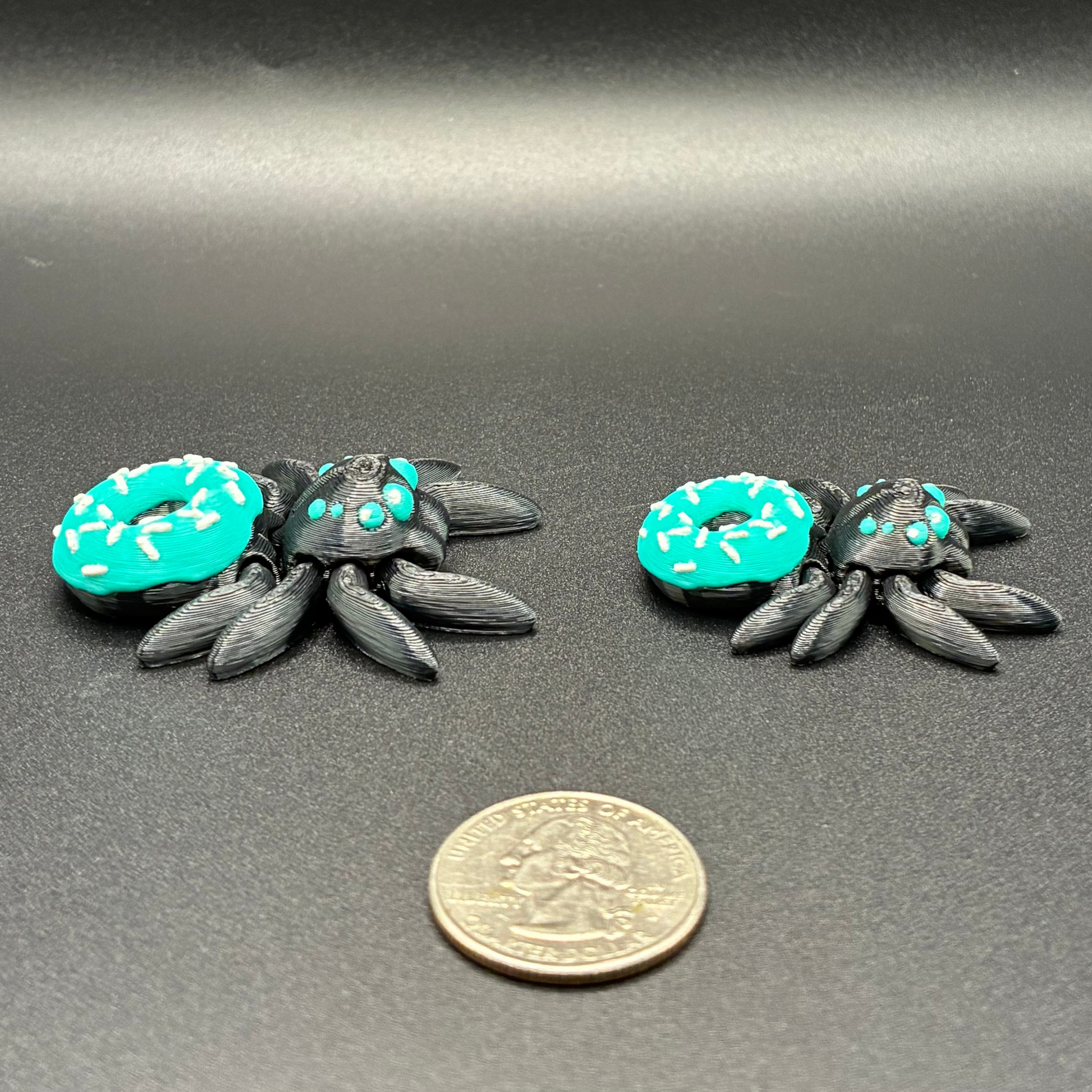 Each size represents the same Donutcap Spider, scaled to fit its collection.
